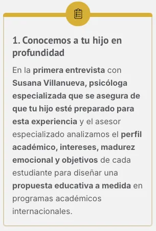 Comenzamos con una entrevista en profundidad, que incluye una valoración emocional con psicóloga infantil especializada. Preparamos al alumno para los retos académicos, sociales y emocionales de la experiencia.